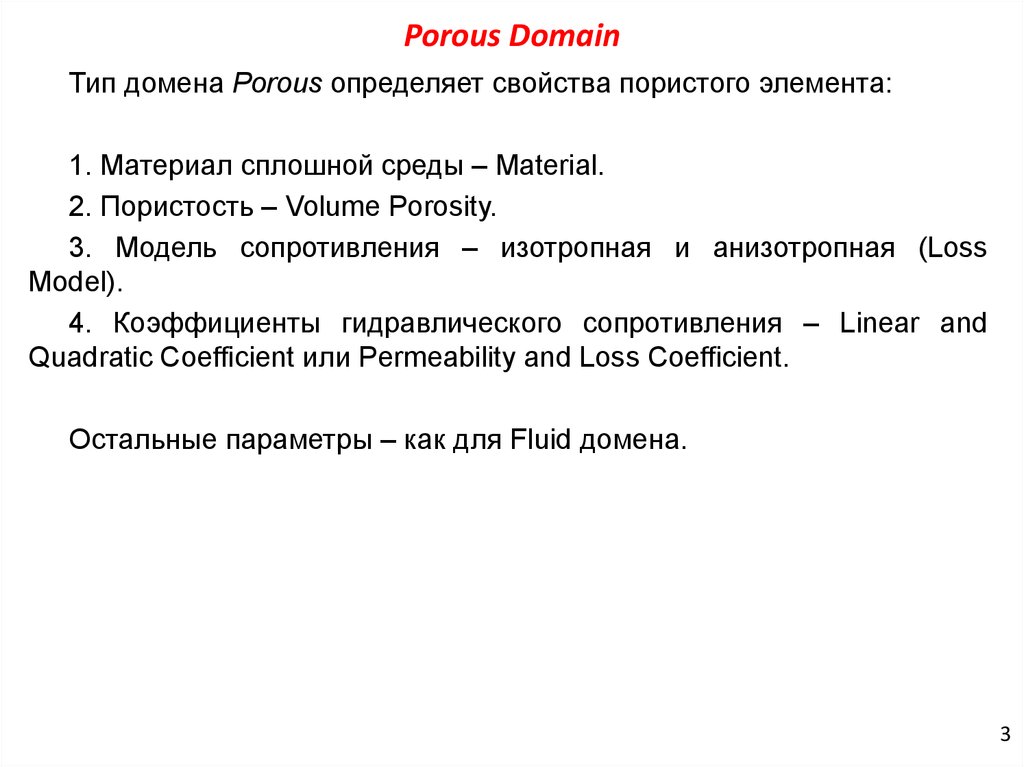 Porous DomainТип домена Porous определяет свойства пористого элемента: