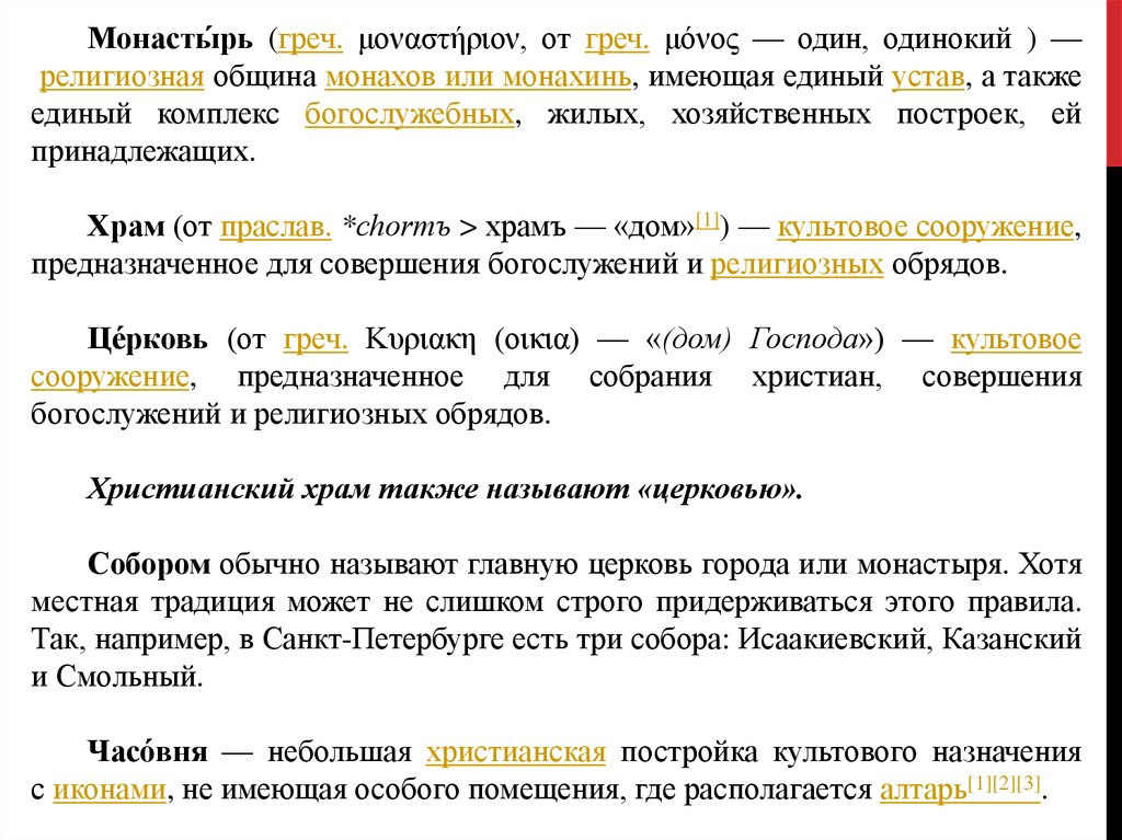 Монасты́рь (греч. μοναστήριον, от греч. μόνος — один, одинокий ) —религиозная община монахов или монахинь, имеющая единый устав, а также