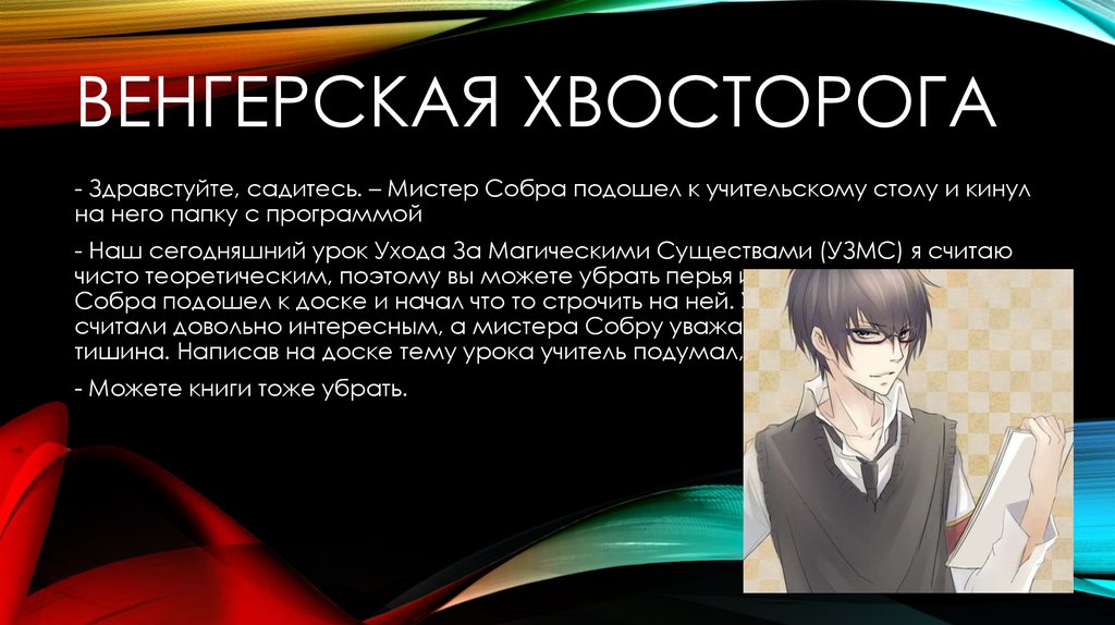 ВЕНГЕРСКАЯ ХВОСТОРОГА- Здравстуйте, садитесь. – Мистер Собра подошел к учительскому столу и кинул
