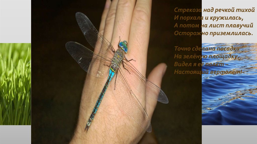 Стрекоза над речкой тихойИ порхала и кружилась,