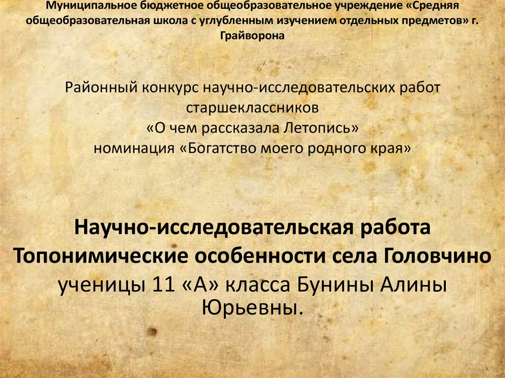Научно-исследовательская работа. Топонимические особенности села Головчино