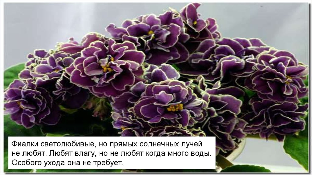 Фиалки светолюбивые, но прямых солнечных лучейне любят. Любят влагу, но не любят когда много воды.