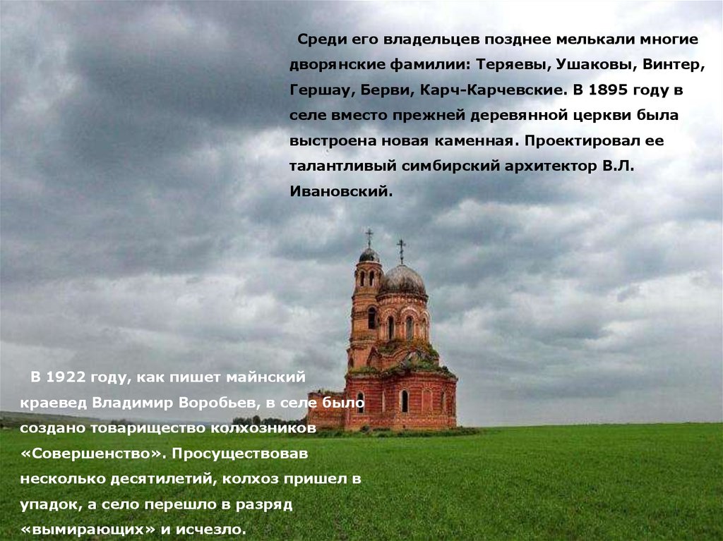 Среди его владельцев позднее мелькали многиедворянские фамилии: Теряевы, Ушаковы, Винтер,