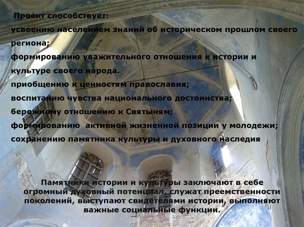 Проект способствует:усвоению населением знаний об историческом прошлом своего