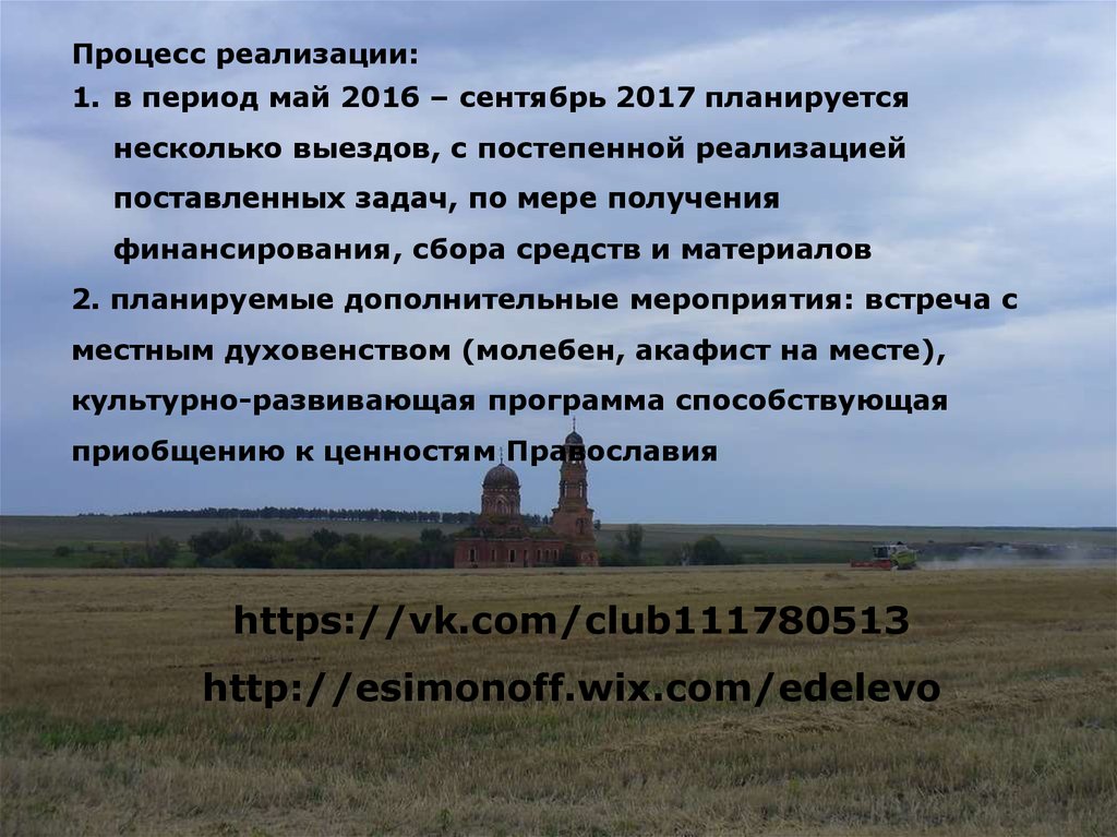 Процесс реализации:1. в период май 2016 – сентябрь 2017 планируется