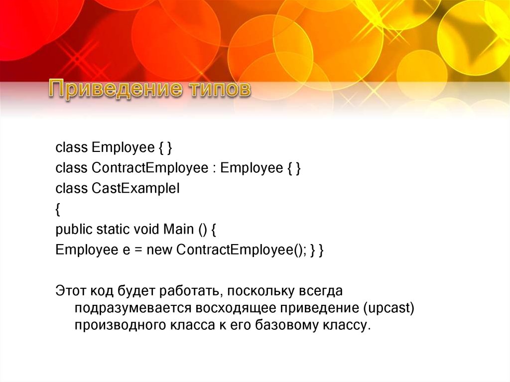 А вот такой код недопустим, так как компилятор непредоставляет неявное нисходящее приведение