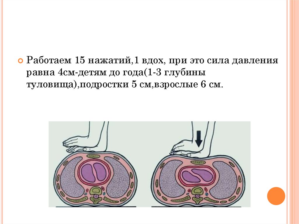 Работаем 15 нажатий,1 вдох, при это сила давленияравна 4см-детям до года(1-3 глубины