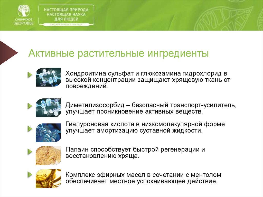 Активные растительные ингредиентыХондроитина сульфат и глюкозамина гидрохлорид в