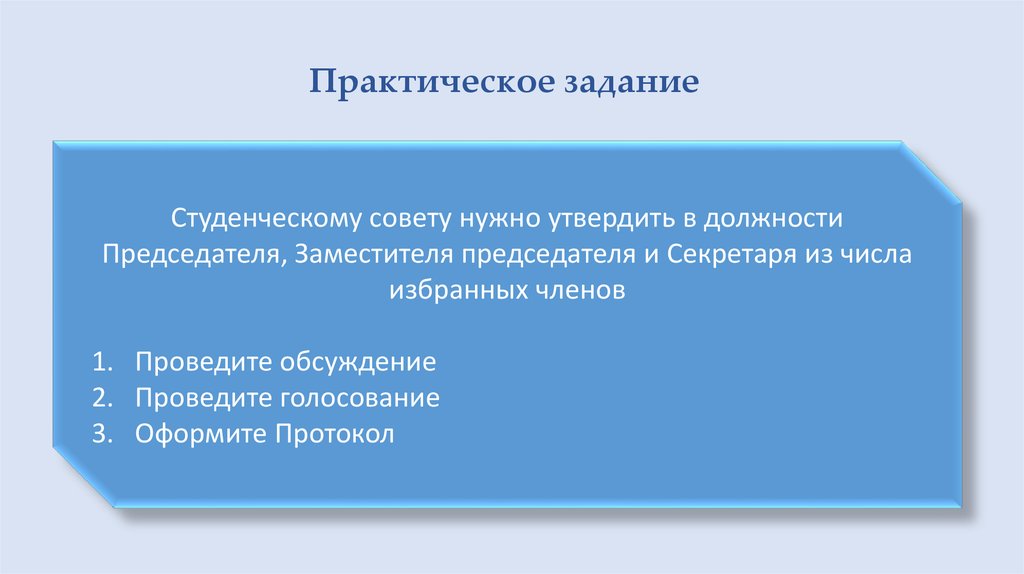 Практическое заданиеСтуденческому совету нужно утвердить в должности