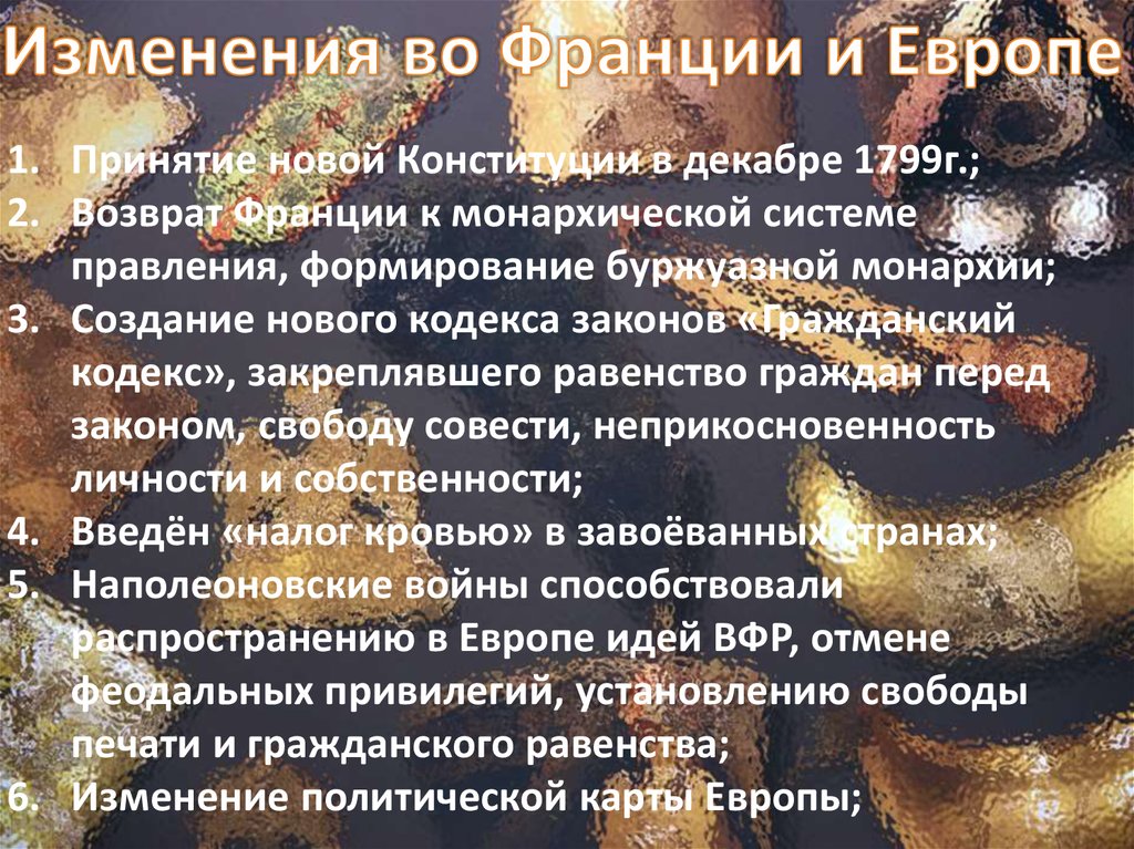 1. Принятие новой Конституции в декабре 1799г.;2. Возврат Франции к монархической системе