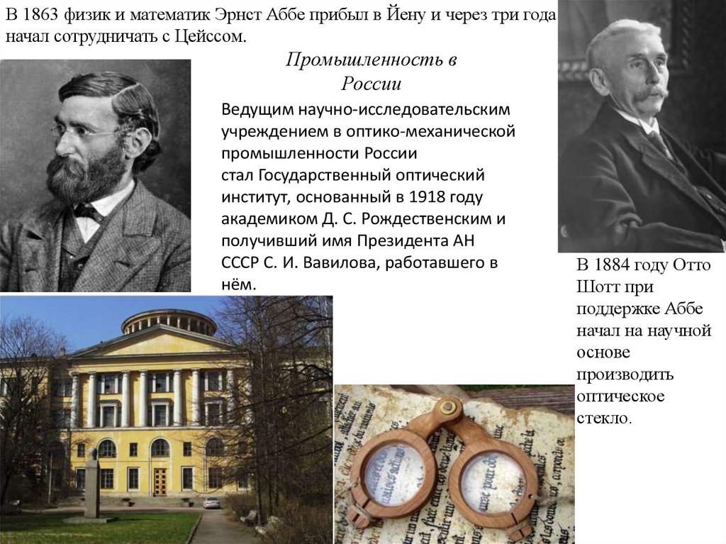 В 1863 физик и математик Эрнст Аббе прибыл в Йену и через три годаначал сотрудничать с Цейссом.