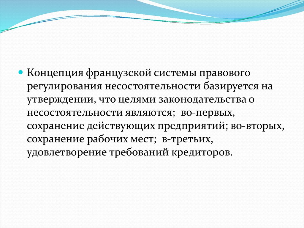 Концепция французской системы правовогорегулирования несостоятельности базируется на