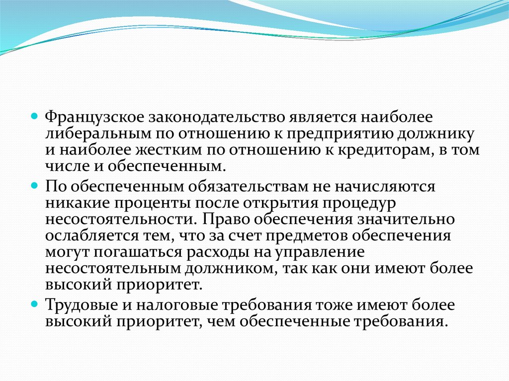 Французское законодательство является наиболеелиберальным по отношению к предприятию должнику
