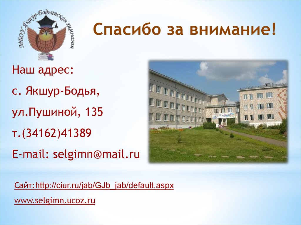 427100, с. Якшур-Бодья, ул.Пушиной,135http://ciur.ru/jab/GJb_jab e-mail: selgimn@mail.ru