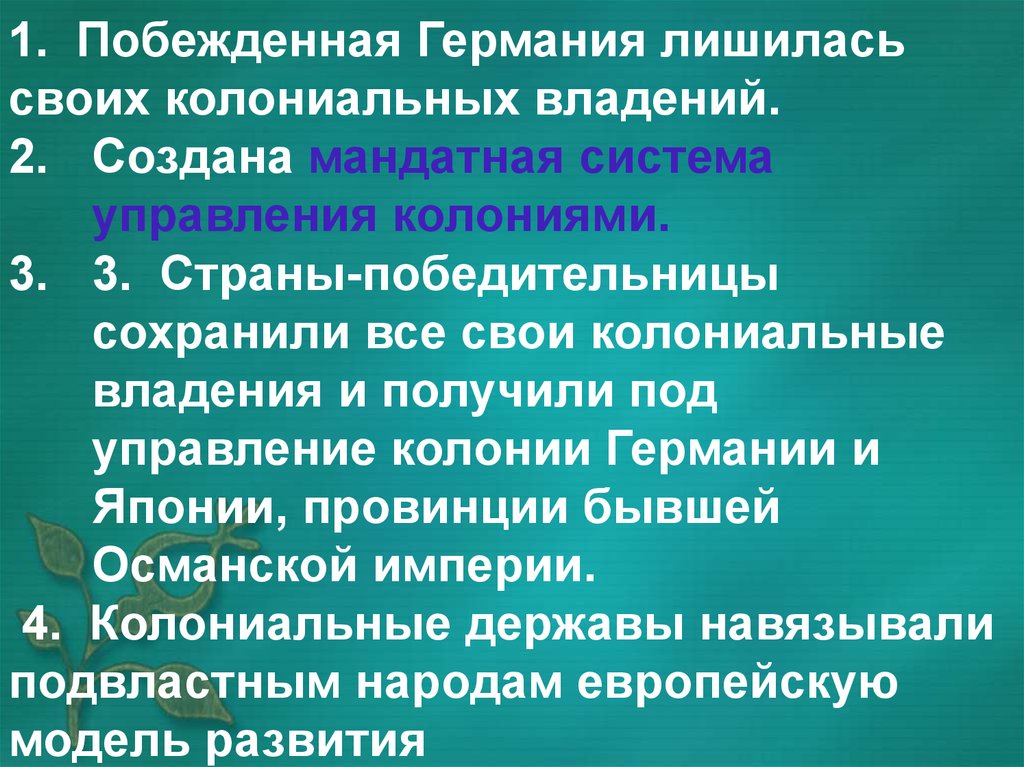 1. Побежденная Германия лишиласьсвоих колониальных владений.