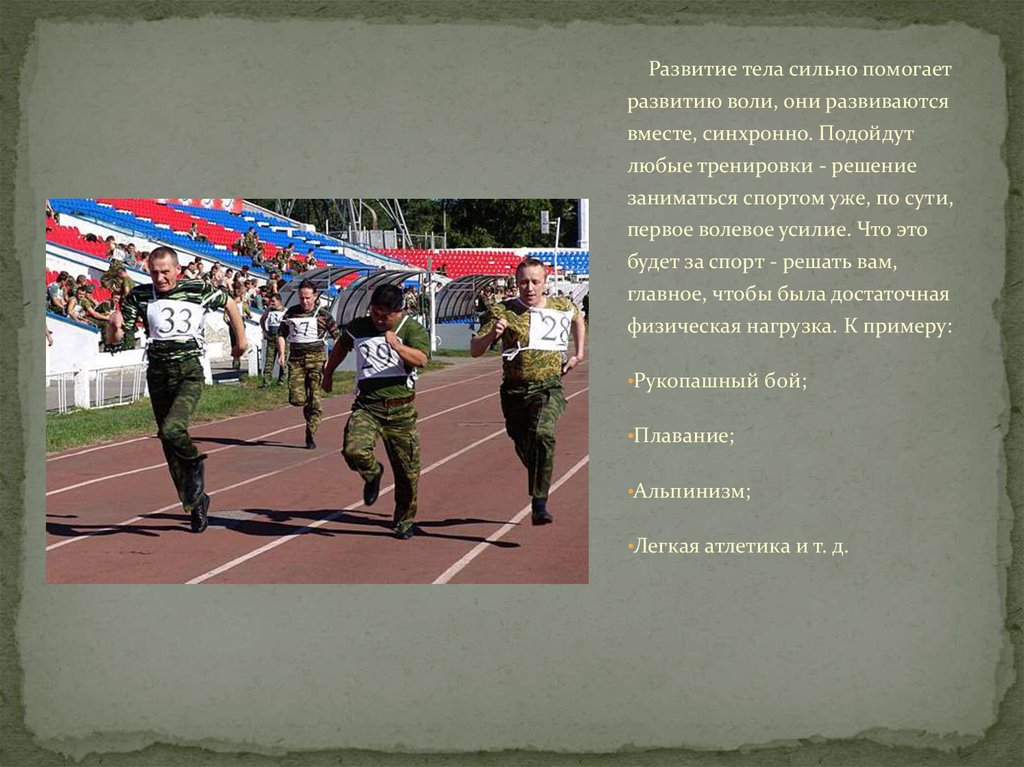 Развитие тела сильно помогаетразвитию воли, они развиваются