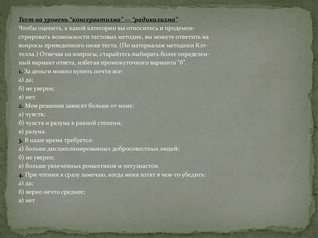Тест на уровень “консерватизма” — “радикализма”Чтобы оценить, к какой категории вы относитесь и продемонстрировать возможности тестовых методик, вы можете ответить на