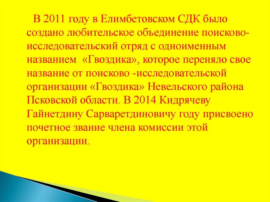 В 2011 году в Елимбетовском СДК былосоздано любительское объединение поисковоисследовательский отряд с одноименным
