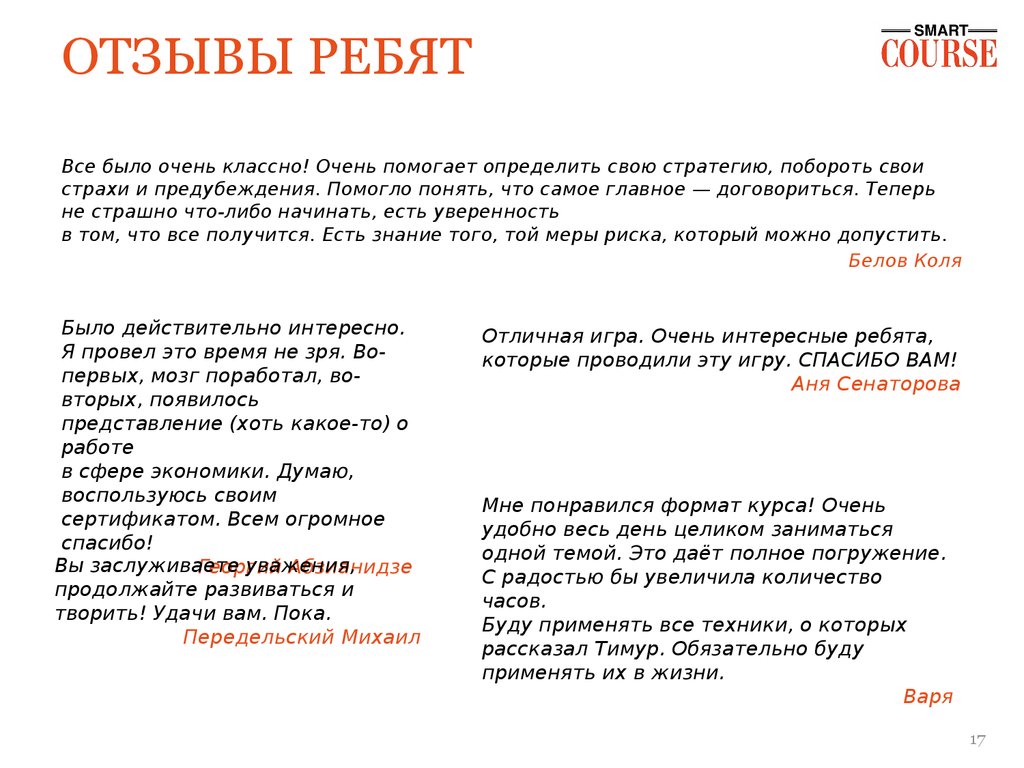 ОТЗЫВЫ РЕБЯТВсе было очень классно! Очень помогает определить свою стратегию, побороть свои