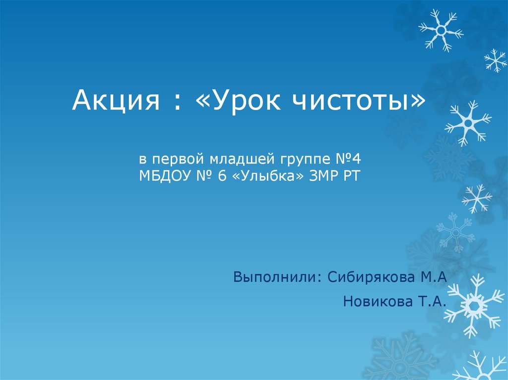 1. Акция : «Урок чистоты» в первой младшей группе №4 МБДОУ № 6 «Улыбка» ЗМР РТ