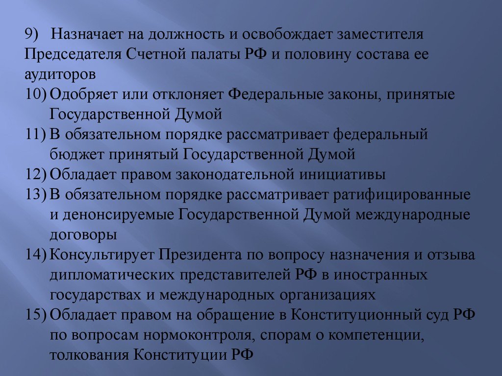 9) Назначает на должность и освобождает заместителяПредседателя Счетной палаты РФ и половину состава ее