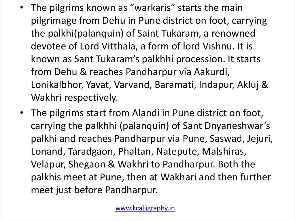 • The pilgrims known as “warkaris” starts the mainpilgrimage from Dehu in Pune district on foot, carrying