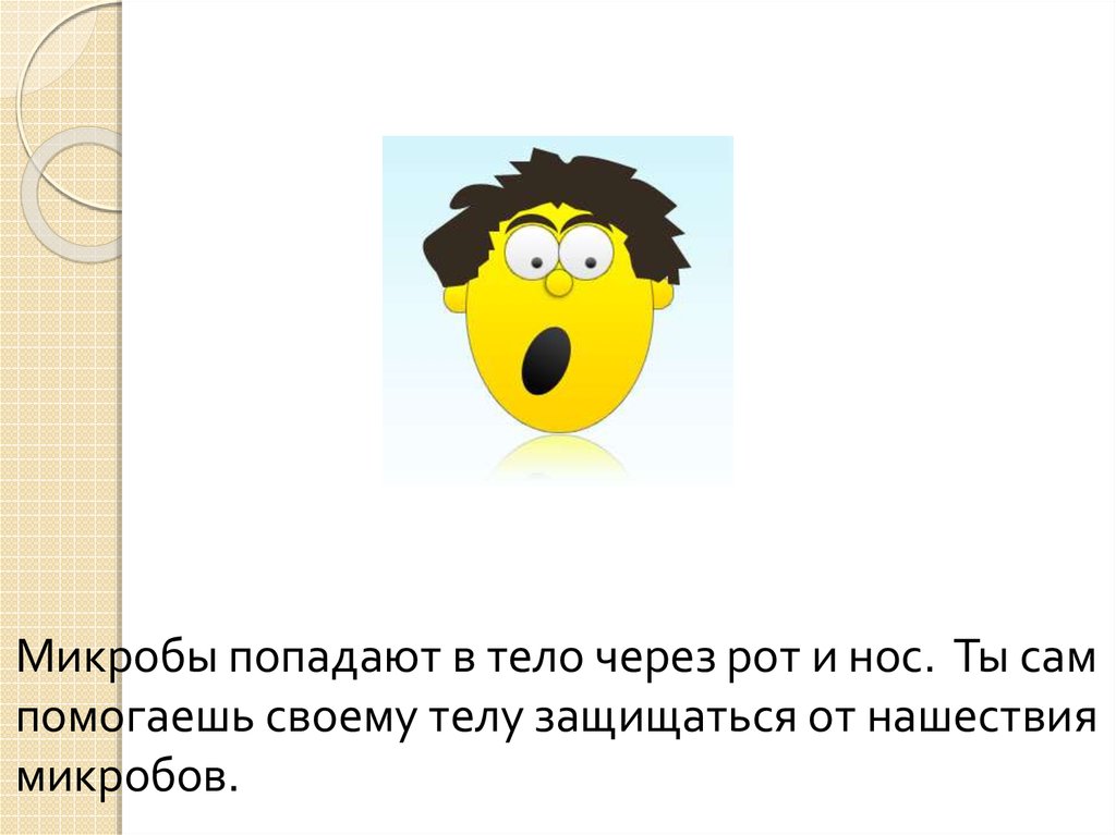 Микробы попадают в тело через рот и нос. Ты сампомогаешь своему телу защищаться от нашествия