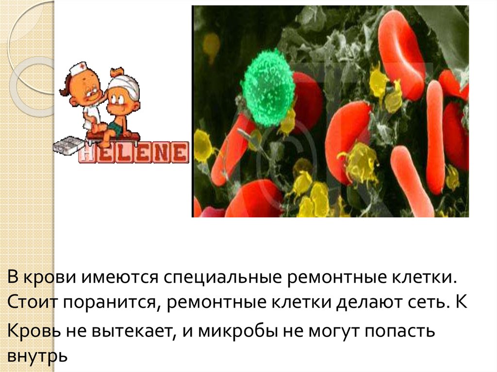 В крови имеются специальные ремонтные клетки.Стоит поранится, ремонтные клетки делают сеть. К