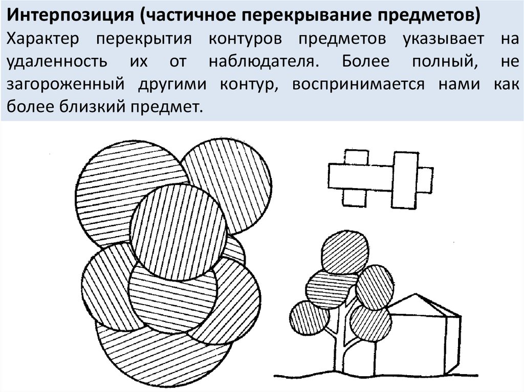 Интерпозиция (частичное перекрывание предметов)Характер перекрытия контуров предметов указывает на
