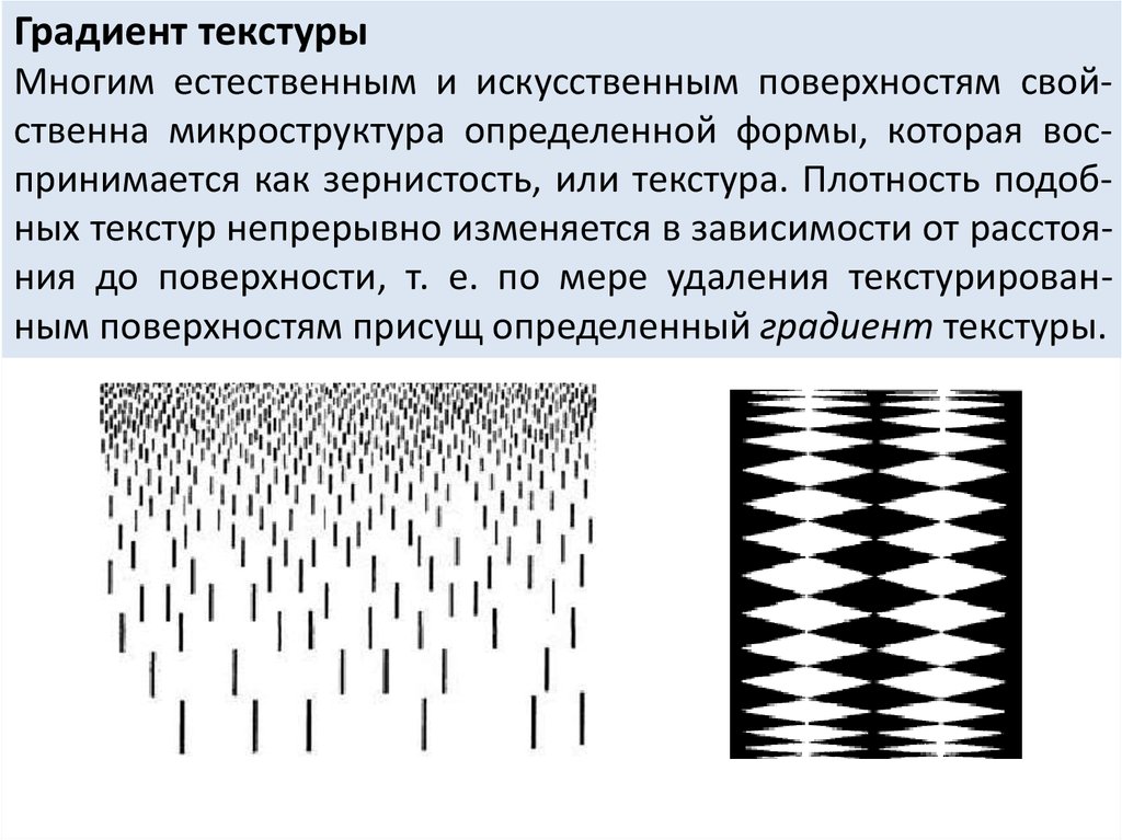 Градиент текстурыМногим естественным и искусственным поверхностям свойственна микроструктура определенной формы, которая воспринимается как зернистость, или текстура. Плотность подобных текстур непрерывно изменяется в зависимости от расстояния до поверхности, т. е. по мере удаления текстурированным поверхностям присущ определенный градиент текстуры.