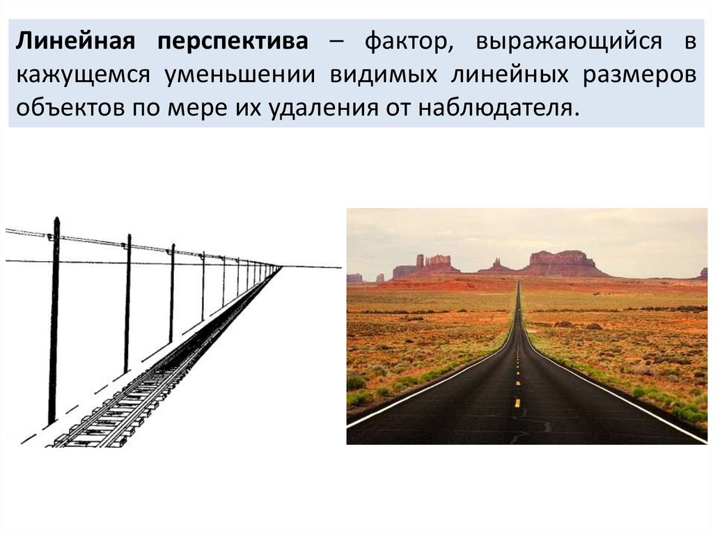 Линейная перспектива – фактор, выражающийся вкажущемся уменьшении видимых линейных размеров