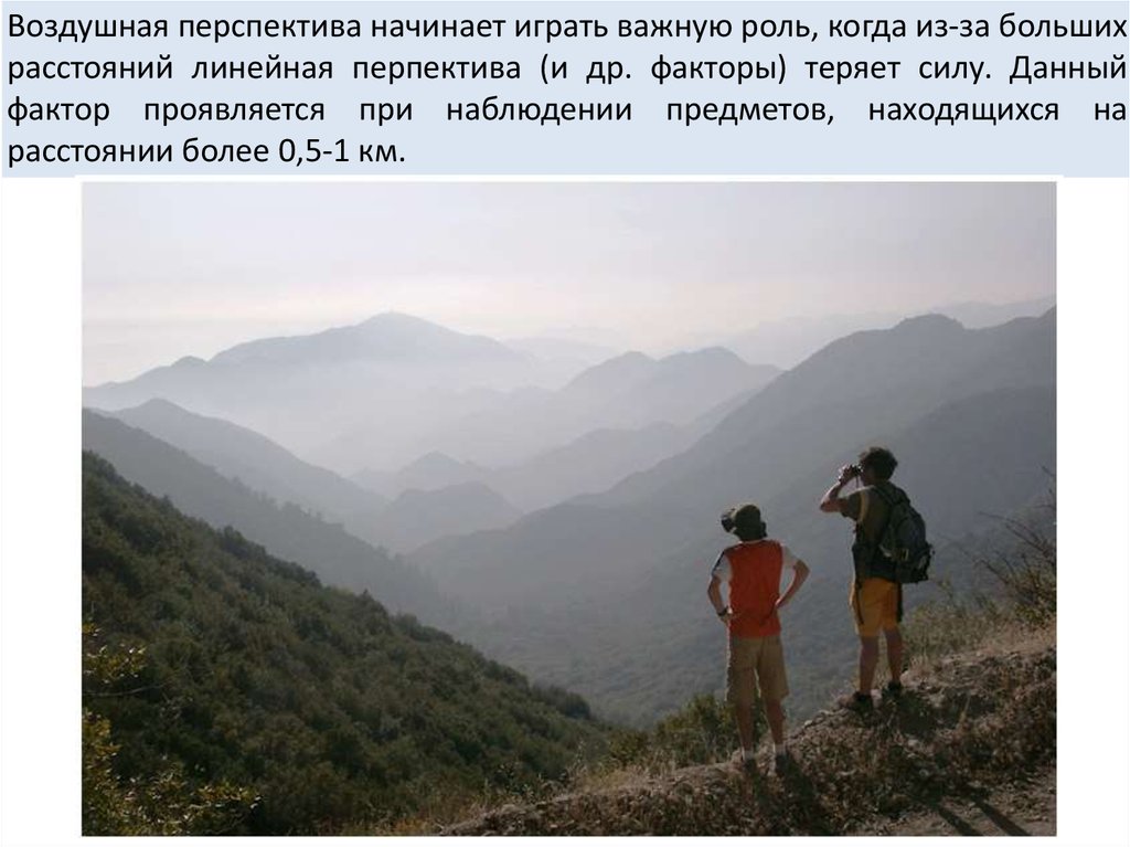 Воздушная перспектива начинает играть важную роль, когда из-за большихрасстояний линейная перпектива (и др. факторы) теряет силу. Данный