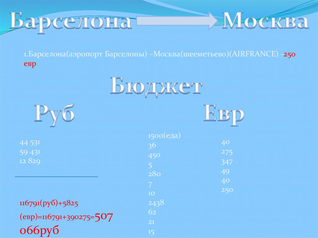 1.Барселона(аэропорт Барселоны) –Москва(шееметьево)(AIRFRANCE) -250евр