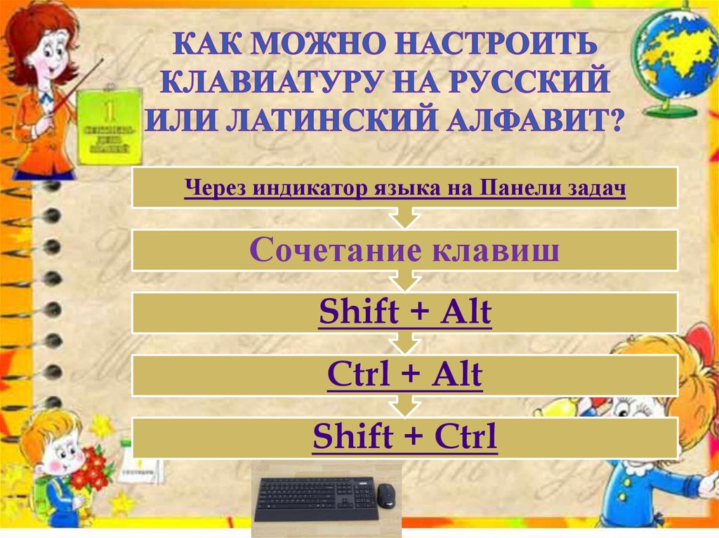 Через индикатор языка на Панели задачСочетание клавиш