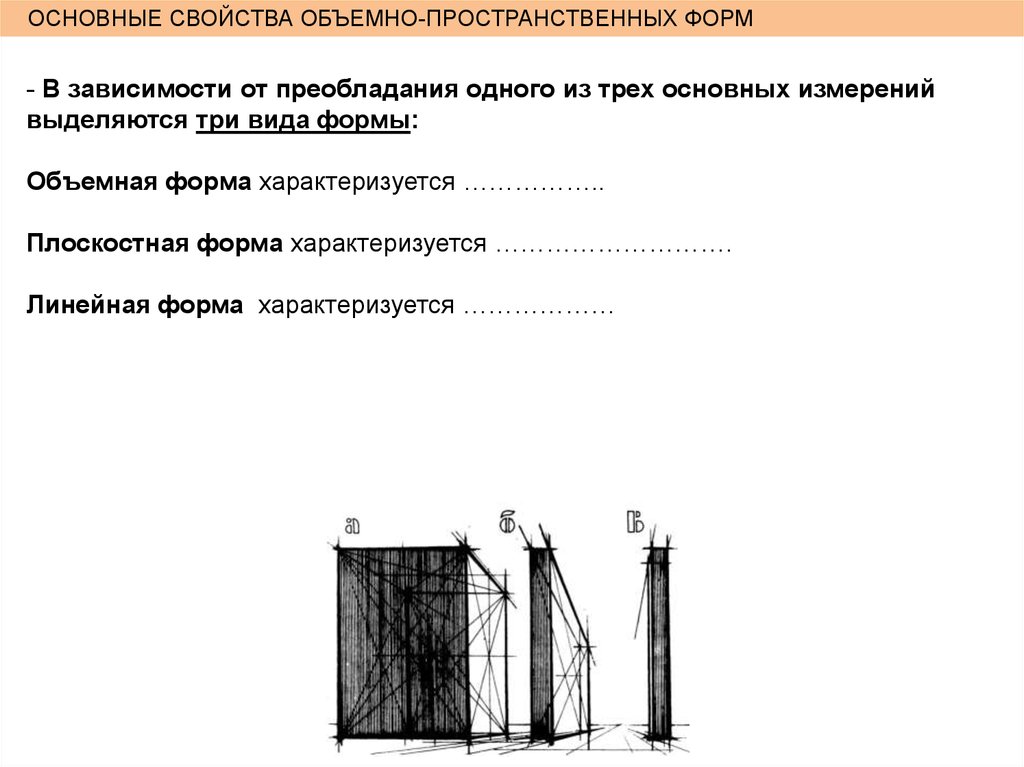 ОСНОВНЫЕ СВОЙСТВА ОБЪЕМНО-ПРОСТРАНСТВЕННЫХ ФОРМ- В зависимости от преобладания одного из трех основных измерений