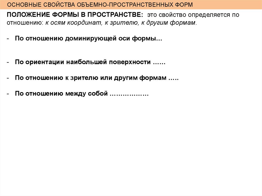 ОСНОВНЫЕ СВОЙСТВА ОБЪЕМНО-ПРОСТРАНСТВЕННЫХ ФОРМПОЛОЖЕНИЕ ФОРМЫ В ПРОСТРАНСТВЕ: это свойство определяется по