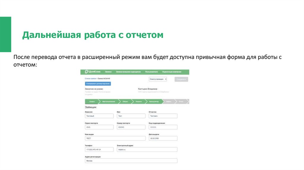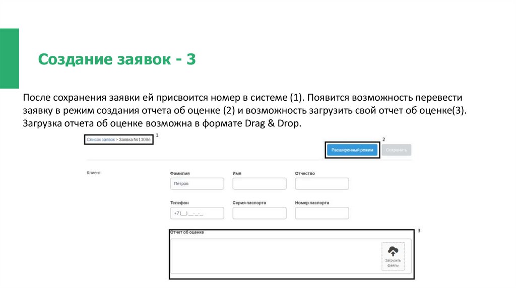 заявку в режим создания отчета об оценке (2) и возможность загрузить свой отчет об оценке(3).