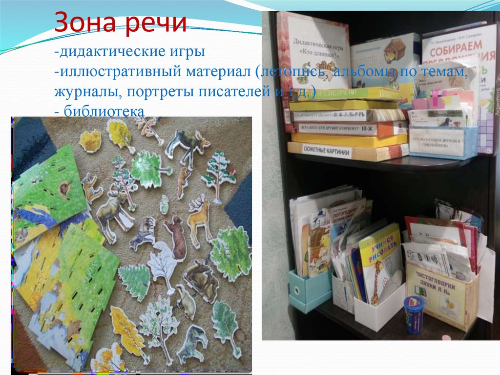 8. Зона речи -дидактические игры -иллюстративный материал (летопись, альбомы по темам, журналы, портреты писателей и т.д.) -
