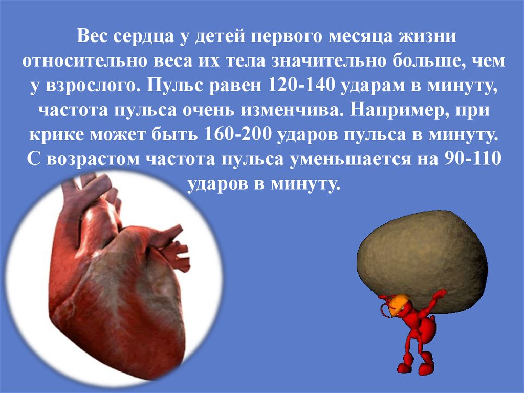 Вес сердца у детей первого месяца жизниотносительно веса их тела значительно больше, чем