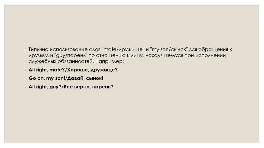 ◦ Типично использование слов "mate/дружище" и "my son/сынок" для обращения кдрузьям и "guy/парень" по отношению к лицу, находящемуся при исполнении