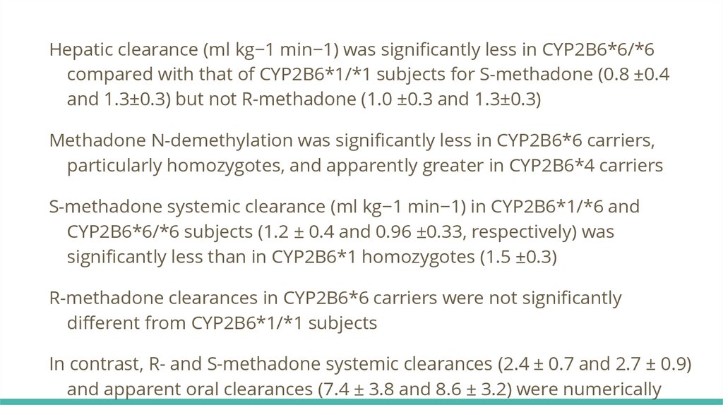In contrast, R- and S-methadone systemic clearances (2.4 ± 0.7 and 2.7 ± 0.9)