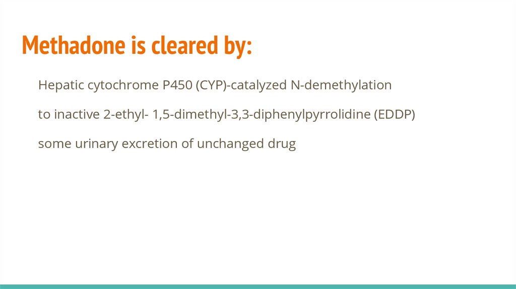 Methadone is cleared by:Hepatic cytochrome P450 (CYP)-catalyzed N-demethylation