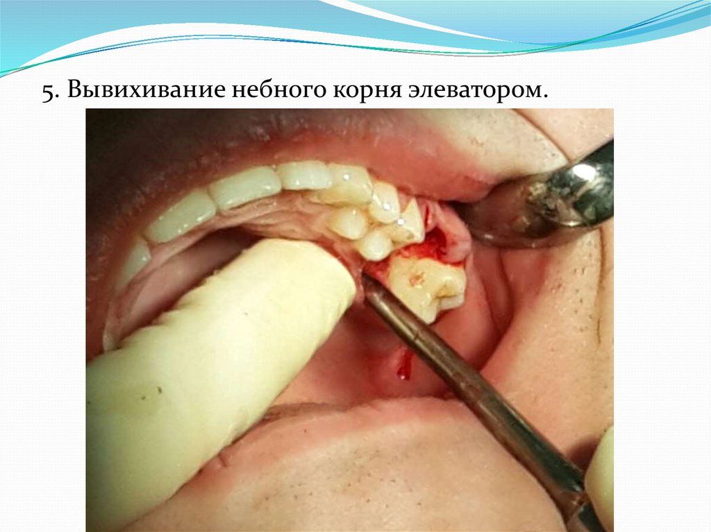 элеватора смещают в щечную сторону и вывихивают небный корень.