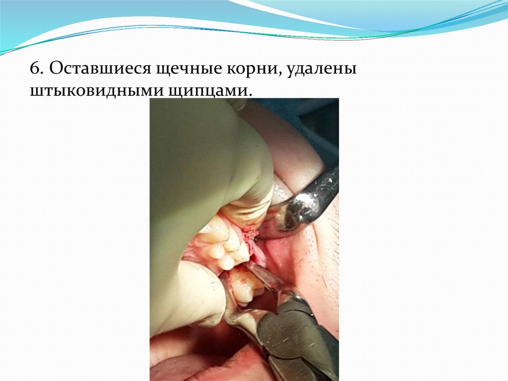 6. Оставшиеся щечные корни, удаленыштыковидными щипцами.
