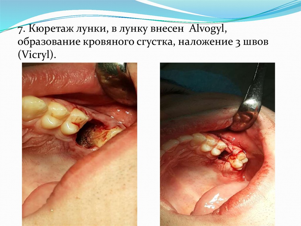 7. Кюретаж лунки, в лунку внесен Alvogyl,образование кровяного сгустка, наложение 3 швов