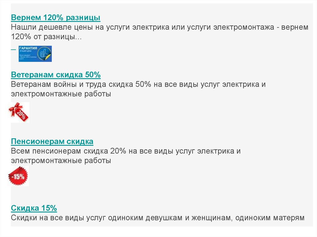 Ветеранам войны и труда скидка 50% на все виды услуг электрика и