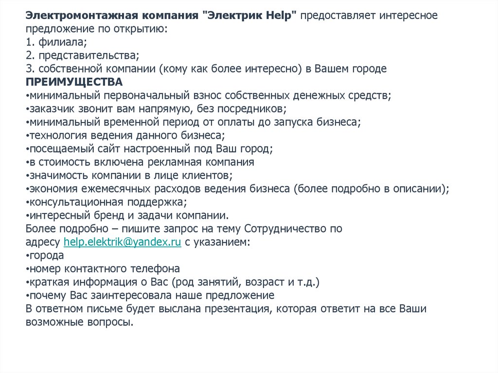 Выберите Ваш город и филиал "Электрик Help"Компания "Электрик Help" выполняет электромонтажные работы,