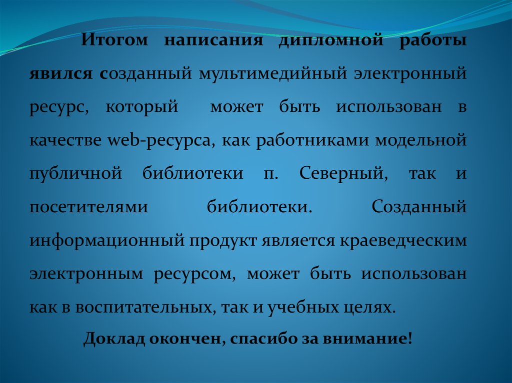 Итогом написания дипломной работыявился созданный мультимедийный электронный