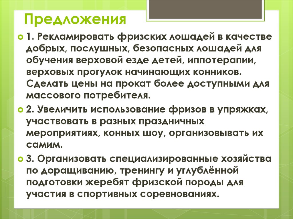 1.Рекламировать фризских лошадей в качестве