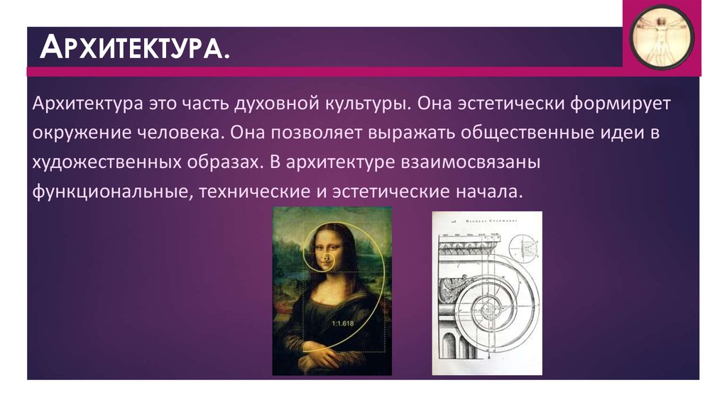 АРХИТЕКТУРА.Архитектура это часть духовной культуры. Она эстетически формирует
